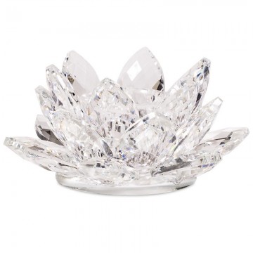 Lotus lysestage på 3 x 8 cm – krystal. Lysestage smukt formet som en Lotusblomst i krystal glas, en lotusblomst, som strækker sin bløde og skrøbelige kronblade mod himlen. I Feng Shui bruges krystaller til at tiltrække chi (energi) udefra ind i mørke eller dystre områder i huset – Når sollyset rammer krystallet, fyldes rummet med regnbuens farver og sender lys i alle retninger – herved brydes forvirrende og uønsket chi (energi). Lotus atmosfærisk belysning. Lotus symboliserer mørkets omdannelse til lys, uvidenhed i viden. Lotus symboliserer også de 7 energicentre i menneskekroppen, chakraerne. Lotusblomsten repræsenterer fred og renhed og symboliserer, at når problemer dukker op, uanset hvor mørkt det kan se ud, kan du hæve dig over det og lade den smukke blomst inde i dit hjerte florere. Ifølge buddhismen symboliserer lotusblomsten det uendeliges potentiale og signalerer ændringer, transformation og nye begyndelser. Lotusplanten rummer symbolikken om vores (menneskets) udvikling og skæbne. Den har sine rødder i mudderet, vokser op gennem vandet og kommer op til overfladen op i luften. Den åbner sig og spreder sine slanke kronblade om morgenen og lukker dem om aftenen. På denne måde bliver den et symbol på menneskets liv i de tre verdener. Lotus har betydning af det lille lys i mørket – om håbet, fightervilje og det aldrig at give op, uanset hvor hårdt livet er – om rejsen gennem livskriser til vigtige erkendelser.