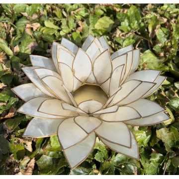 Kanterne på de smukke blade er i guld farve. Lotus symboliserer mørke til lys, uvidenhed til viden. Lotus symboliserer også de 7 energicentre i den menneskelige krop, chakraerne. Om Capiz Shells: Capiz-skaller er faktisk de ydre skaller af et marint bløddyr; dets videnskabelige navn er placuna placenta, mere almindeligt kendt som "vinduesøsters". Filippinske Capiz-skaller er så navngivet, fordi de oprindeligt blev høstet fra det lavvandede kystvand nær byen Capiz på øen Panay. Når de er renset, er skallerne naturligt gennemskinnelige og giver, når de er malet, et herligt samspil mellem lys og farve. Mål: H: 10 cm x B: 15 cm Materiale: Metal og skaller.