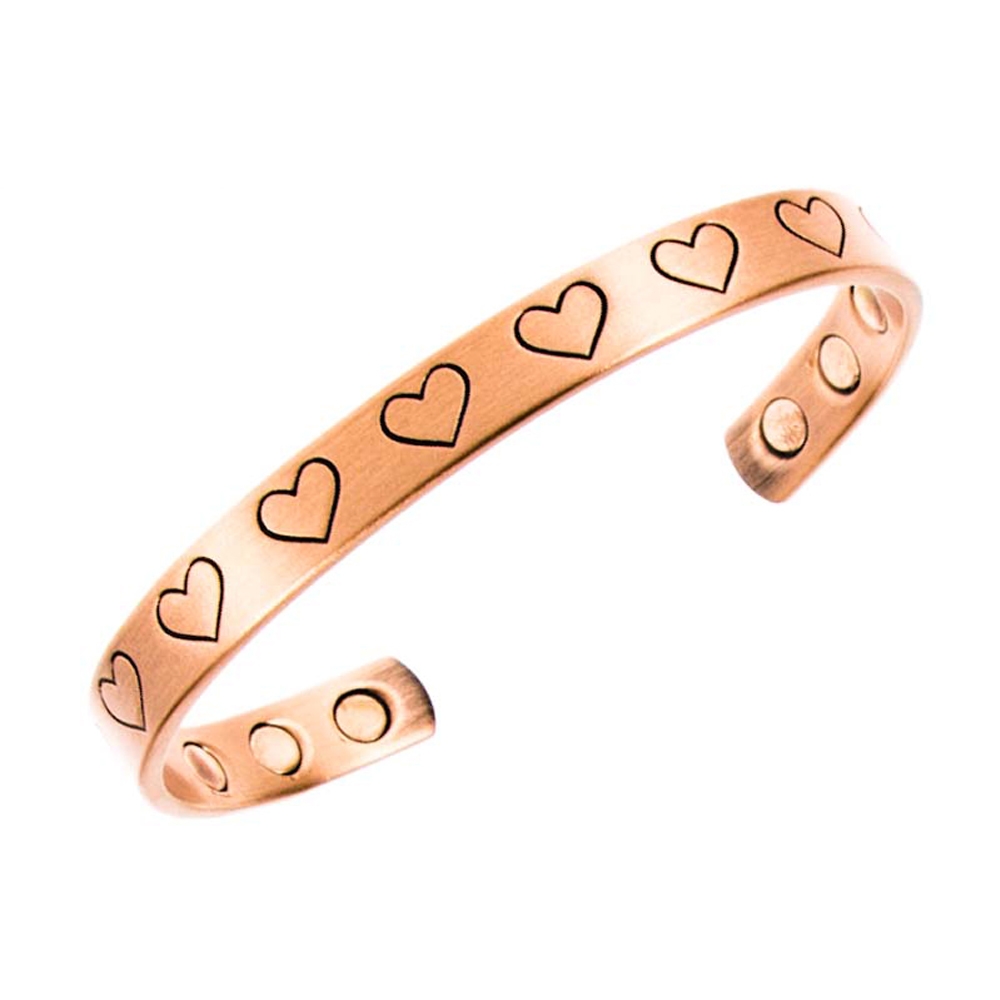Magnet armring i kobber En magnet armring lavet af kobber har både de gode virkninger fra magneterne og kobberen. Kobber er et vigtigt grundstof, der bruges af de røde blodceller til at transportere ilten. Kobberen er også vigtig til produktion af collage, som har stor betydning for vores knogler, brusk, hud, hår og opretholdelsen af kroppens immunforsvar. Mennesker, som lider af leddegigt fortæller, at kobber magnetarmbånd kan mindske smerte og betændelse, fordi spor af mineralet trænger ind og lindre.