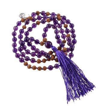 Mala Halskæde med ametyst (Indre fred) og Rudraksha. Mala Halskæden består af 74 ametystperler (6 mm diameter), 34 Rudraksha nødder er forsigtigt trukket på en tråd, der passer til ametystens farve. På bagsiden af Malas er der et vedhæng med OHM-symbolet og en chili (alle lavet af sølv 925). Bønkæden er 48 cm lang, kvasten er 8 cm lang. Ametyst står for den indre fred i moderne stenhelbredelse. Mineralet bruges til at understøtte alarmen og bevidstheden samt styrkelsen af dommen og konstruktiv tænkning. En mala er en traditionel indisk meditationkæde med forskelligt antal træperler afhængig af kædens størrelse.Der er 108 større nadier, som alle mødes i hrit padma-chakraet lige under hjertet. Ved at gentage et mantra 108 gange i meditation, berører man energimæssigt alle de 108 vigtige nadier. Rudraksha er kernen fra Rudrakshatræets frugt. Det betyder Shivas øjne og symboliser bindeledet mellem himmel og jord. Det er i Indien dybt forbundet med meditation og spirituel udvikling. Ifølge overleveringen åbnede Lord Shiva efter en lang meditation øjnene. Han fældede i dyb fredfyldthed en tåre, som Rudrakshatræet opstod fra. Kernerne bliver ofte brugt i malaer eller som pendul.