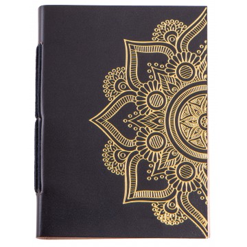 Mandala Læderindbundet med guldprægning og af genbrugspapir – lavet af en miljøvenlig blanding af papir og bomuld. Dette papir er stærkere end normalt og stadig vidunderligt at skrive på. En lille skat af indisk håndværk! Mandalaer har altid været brugt til at skabe en afslappende atmosfære af nærvær og empati. Meditativ kontemplation lader vores sind hvile. Nye tanker og dyb visdom opstår. Guld præget på begge sider. 144 sider, blanke, H: 18 cm, B: 13 cm
