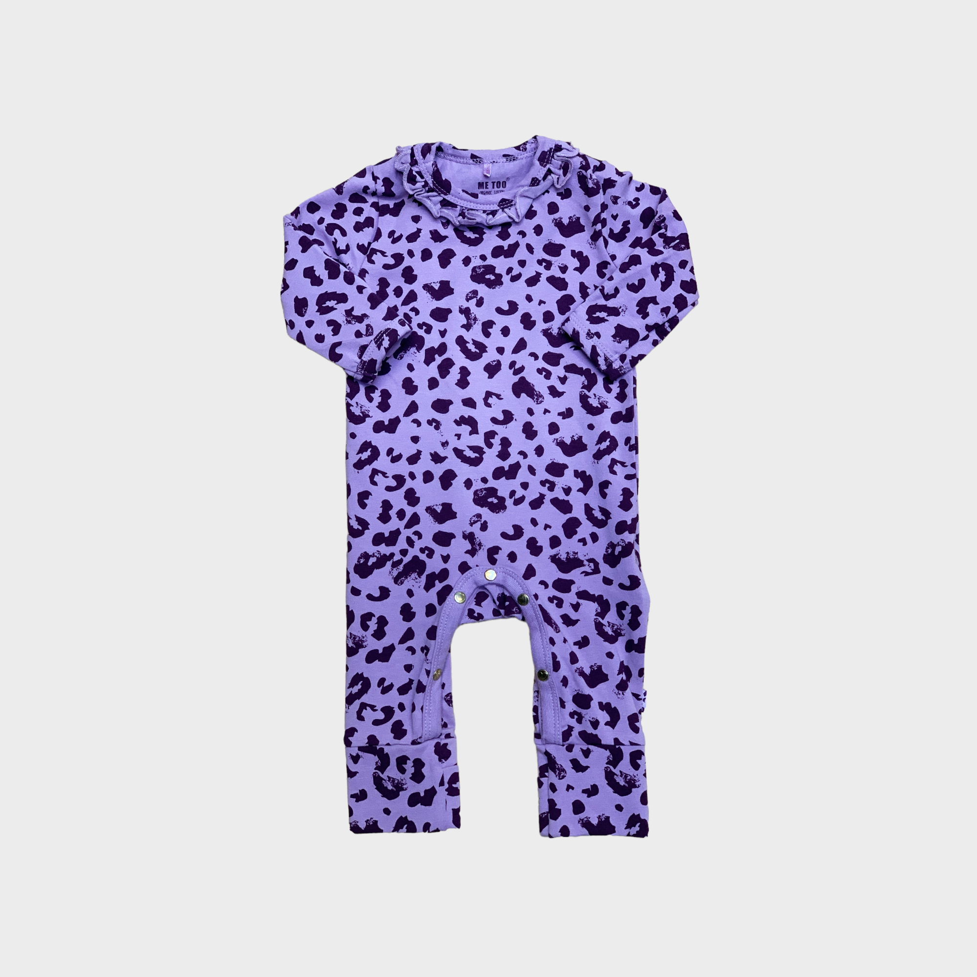 Fin jumpsuit fra Me Too med trykknapper. Farve : Purple Print. Fremstillet i 95% bomuld, 5 % elastan.