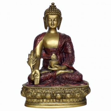 Medicin Buddha er helbredelsens Buddha. Den venstre hånd ligger i skødet med håndfladerne opad holdende en medicinskål. Højre hånd holder en gren fra myrobalantræet, en indisk urtemedicinsk plante. Meningen med Medicin Buddha mantraet er at transformere følelsesmæssige tilstande og afbalancere krop og sind. Mantraet lyder: ”Teyata om bekanze Bekanze maha bekanze Radza samudgate soha”. Det er den samme Buddha på de to billeder, lyset er bare forskelligt. Højde: 30 B: 20,5 x D: 13 cm Vægt: 4.3 kg.