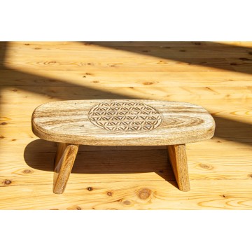 Meditationsskammel med Livets blomst; Stabil meditations bænk med 3 cm tykke mangotræpaneler. På sædet er indgraveret til støtte for meditationen en 16 cm livets blomst. Meditations skammel Flower of Life Mål: H: 15 cm, L: 40 cm, B: 18 cm Vægt: 1,43 kg.