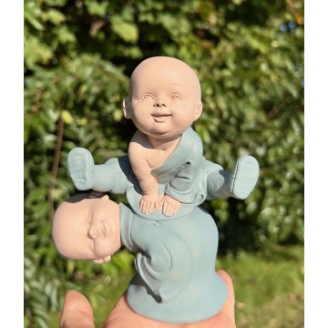 To søde og legende munke iført grønne klæder. Den ene munk står lænet forover imens den anden bærer sig selv på sine stærke arme, på ryggen af den første i en flot gymnastisk position. Eller i et flot spring! Munke dedikerer deres liv til det åndelige og forbinder sig dagligt via meditationer til en højere energi. I Asien bliver de hædret fordi de hæver landets åndelige energi og plejer deres medmennesker på en åndelig måde. På grund af deres immaterielle sans for livet tager samfundet omsorg for deres fysiske velvære på en hengiven og ydmyg måde. De betaler også for deres transportomkostninger, hvis munkene vil besøge andre templer. Vores kærlige Munke minder dig om, at der er meget mere i vores verden, og de sender ro, mildhed og visdom. Mål: H: 14.5 cm D: 9 cm B: 12 cm Materiale: Polyresin Vægt: 0.3 kg