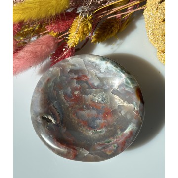 Ocean Jaspis den du får er den smukke på billedet. Nøgleord:Fred, berigende og forståelse Energier: Denne krystal giver dig fred og får dig til at insisterer på at give slip på bekymringer, fortvivlelse og uro i hele din krop og i dit sind, så du kan lande og være fysisk og åndeligt til stede i livet – i nuet Den er super god til at give dig følelsen af lykke, glæde, og at alt er godt i livet. Den giver dig muligheden for, at du bliver i stand til at tiltrække alle de positive ting ind i dit liv, og den får dig til at se vejen frem til dine skjulte evner og en indre forståelse af, at ALT er muligt og kan lade sig gøre i verden. Den får dig til at indse og forstå den indre kæmpe styrke du besidder, og at denne styrke kan besejre nedgørelse og udnyttelse. Du får følelsen af selvtillid, magt og en selvstændigheds følelse – samt det at kunne sige fra. Affirmation: "Jeg skaber glæde og nydelse for mig selv og min krop" Chakra: Alle Mål: H: 2,5 cm, B: 9 cm, D: 9 cm. Vægt: 191 g. Vores sten og krystaller er af højeste kvalitet, da alle bliver nøje udvalgt. Men er ikke ens, så der kan forekomme forskelle i udseende, størrelse og ujævnheder.