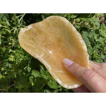 Håndslebet Orange calcit skål. Skålen er af naturmateriale, dette gør hver skål helt unik, med flossede kanter og spil i stenen. Denne naturlige orange calcite har en gennemsigtig, glødende, orange farve. Stenen hjælper med at integrere det åndelige rige med den fysiske krop, den øger kreativiteten, og er nyttig ved følelsesmæssige problemer. Brug Orange Calcit til at aktivere og rense de nederste chakraer. Brug calcit til at rydde op i gamle energimønstre og øge personalets motivation og drive. Calcit øger mental dømmekraft og analyse, øger hukommelse og indlæringsevne. Den kan hjælpe dig væk fra gamle forældede tankemønstre og bane vejen for nye ideer. Calcit vil give dig mere motivation, inspiration og håb. Calcit er kendt for sin evne til at fjerne blokeringer og eliminere negative energier fra hjerte og sind. Det vil stimulere dine mentale energier, så du vil være i stand til at tackle forholdsproblemer med et klart hoved. Det vil også hjælpe dig med at finde en sund balance mellem dine tanker og følelser, ikke for at være for følelsesladet. Calcit vil guide dig i at give slip på fortiden og være fuldt bevidst i nutiden, så du kan træde trygt ind i fremtiden. Chakra: Solar plexus. Nøgleord: Åbenhed, effektivitet, glæde og selvværd. Mål ca.: D: 9 x B: 6 H: 2 cm. Hver skål er håndlavet, så den kan variere af udseende.