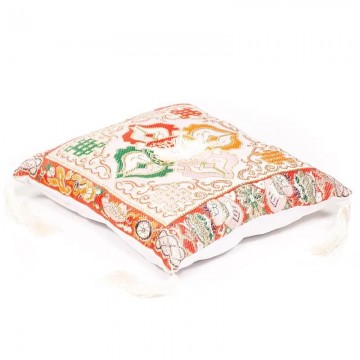 Mål: 20cmx20cm. Syngeskålen høre ikke med. Puden er helt hvid på den ene side, på den anden side er der vævet et flot tibetansk mønster. Meget flot og eksklusiv pude til syngeskåle fra ca 12 cm og op.