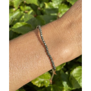 Pyrit er en stærk grundsten, der fremmer indsigt i dine motiver og værdier. Hjælper med at øge selvtilliden og sætter dig med begge fødder på jorden. Den er god for din overorden. Understøtter også realisering af mål. Krystallens str.: 3 mm. facetslebet Armbåndet er lavet på en smykke elastik som gør det nemt at tage af og på. Armbåndet er ca. 16 til 19 cm/one-size. Chakra: Rod og solar plexus.