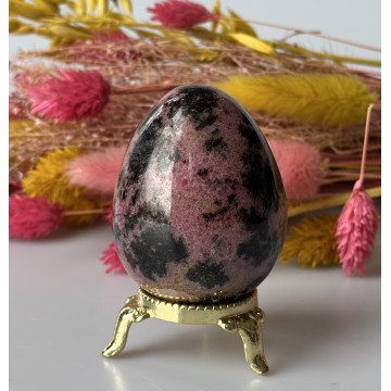 Rhodonit æg. Nøgleord: Harmoni, fred, tillid og optimisme. Energier:Rhodonit er en krystal, der udstråler en stærk og beroligende energi. Den hjælper dig med følelsesmæssige smerter og skaber balance heri. Den skaber tillid og optimisme i dit liv, når du giver dig hen og arbejder sammen med denne skønhed. Den er genial, når du skal tage store beslutninger i dit liv, så som i dine relationer, karriere eller personlige livsændringer. Den kommer med en energi af frygtløshed og lidenskab i alt, hvad du foretager dig i dit liv, så du ikke lader dig begrænse i din udvikling. Du får ikke kun øje på udfordringerne i dit liv, men også hvordan du kan løse dem bedst muligt. Affirmation:"Jeg genfinder roen i mit hjerte. Jeg slipper smerten og finder fred." Chakra: Rod og hjerte Ægget symbolisere fødsel, frugtbarhed og begyndelsen på noget nyt. Mål: Ca. 6 x 4 cm Vores sten og krystaller er af højeste kvalitet, da alle bliver nøje udvalgt. Men ikke ens, så der kan forekomme forskelle i udseende, størrelse og ujævnheder
