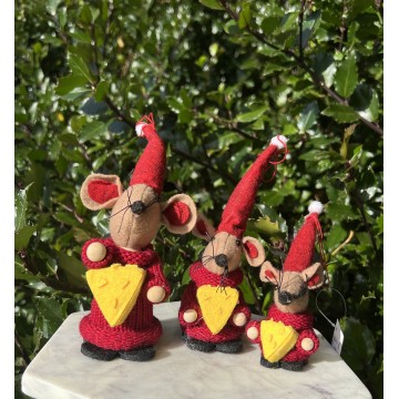 Tre små nissemus står side om side, klar til at sprede juleglæde med deres nuttede udtryk og sjove påfund. Hver mus har en lille nissehue på hovedet, der får dem til at se bedårende ud. De store, nysgerrige ører stritter frem under huen, og deres røde, strikkede sweatre får dem til at se både varme og klar til jul ud. I hver lille hånd holder de et stykke ost – måske deres helt egen julegodte! Med glimt i øjnene ser de ud til at være fulde af sjove historier og julens magi. Sammen bringer de et strejf af charme og en stor portion hygge til ethvert hjørne af julehjemmet. Mål: H: 12 – 20 cm x B: 4,5 – 6 cm x D: 4 – 6 cm Materiale: Filt, strik, træ, stof. Vægt: 111 g. Farve: Rød, brun, gul, sort. BEMÆRK: Dette er et sæt med 3 stk.