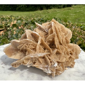 Denne sandrose er helt unik – den du ser, er præcis den, du får. Sandrose, også kendt som ørkenrose eller gipsrose, er en naturligt forekommende mineralformation, der typisk findes i ørkenområder. Sandroser dannes, når vand, der indeholder mineraler som gips eller baryt, fordamper under tørre ørkenforhold. Dette fører til krystallisering af disse mineraler sammen med sandkorn, hvilket giver formationerne deres karakteristiske roselignende udseende.I nogle kulturer betragtes sandroser som symboler på tålmodighed og skønhed, der opstår under vanskelige forhold, en påmindelse om naturens evne til at skabe skønhed selv i de mest udfordrende miljøer. Nøgleord: Skønhed, klarhed og styrke. Sandrosen, også kendt som ørkenrose, er et naturligt mirakel skabt af vind, vand og tid. Den symboliserer skønhed, klarhed og styrke – egenskaber, der vokser frem, selv under de mest udfordrende forhold. Sandrosen fremmer mental klarhed, indre ro og styrke. Den bruges ofte i meditation til at frigive mentale blokeringer og skaber balance i krop og sind. Placeret ved sengen kan den hjælpe til en fredelig og afslappet søvn. Lad sandrosen minde dig om naturens visdom og din egen evne til at finde fred midt i forandring. Affirmation: "Min indre styrker viser mig vejen til fred" Vægt: 271 g. Mål: 11 x 8 x 7 cm Vores sten og krystaller er af højeste kvalitet, da alle bliver nøje udvalgt. Men er ikke ens, så der kan forekomme forskelle i udseende, størrelse og ujævnhede