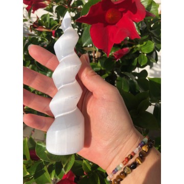 Selenit Spiral ca 10 cm. Giver klarhed i tanker og udvider opmærksomheden fra en selv til andre omkring dig. Arbejder med din beslutsomhed og vil give handlekraft. Det er en stærk sten til at komme af med blokeringer, og er god til at hjælpe dig videre. Den er meget healende. Den hjælper dig i det hele taget med at slappe af i enhver situation. Selenit er en ret stærk oplader både på det fysiske, det psykiske og det spirituelle plan. Selenit kan bringe lyset ind i din hverdag. Selenit har en kraftfuld, men samtidig rolig energi. Den bringer lys og fred, og er et stærkt energiredskab. Den hjælper dig med at få overblik over dit liv nu og her, og hjælper dig til at få klarhed over hvad det er du tiltrækker i livet, og hvilke betydninger det på sigt skal få for dig, og på den måde giver den dig klarsyn over hvad du bør lave om på eller tillægge ekstra energi. Selenit kan anvendes ved næsten alle sygdomsforløb og alle former for energiarbejde, hvor modtageren og giveren virkelig vil mærke hvad det vil sige at arbejde med energier og hvad det kan bringe frem. Den er god til spændinger i hovedet. God til at styrke ryggen og gøre musklerne mere smidige. Chakra: Alle. Stjernetegn: Tyr.