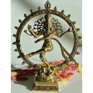 Shiva Nataraja symboliserer flere ting: Shiva har magten til at ødelægge det gamle, så nye ting kan spire. Shiva Nataraja danser af uvidenhed for at opløse den. Hos Shiva var der kun den altomfattende sandhed. Shiva er en super Ideel hjælper til at befri dig fra gamle mønstre! Shiva, hvis navn betyder "venlig – eller" elskværdig, indeholder mange modsigelser: Shiva er venlig og ildevarslende, meditativ og ekstatisk, et univers af gud og alligevel med en præference for visse jordiske steder som Mount Kailash og byen Benares. Shiva tilbedes i mange former, som en stor yogi (Mahayogi), der praktiserer asketisme eller afsætter sig til meditation, som verdens store herre eller som dansens herre, Nataraja, der danser uvidenhed under hans fødder og ødelægger alt, hvad der ikke bygger på sandhed og kærlighed. Shiva Nataraja symboliserer den store renselsesperiode, der i øjeblikket finder sted på vores planet. Mål: H: 37 cm. x B: 29 cm Materiale: Guld Vægt: 950 g. Farve: Guld
