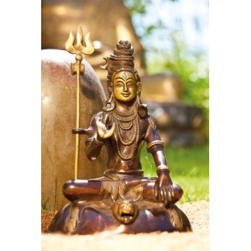 Shiva. Lavet af messing. Shiva har magten til at ødelægge det gamle, så nye ting kan spire. Shiva Nataraj danser af uvidenhed for at opløse den. Hos Shiva var der kun den altomfattende sandhed. Ideel til at befri dig fra gamle mønstre. Shiva, hvis navn betyder "venlig – eller" elskværdig – er enig i mange modsigelser i sig selv: Shiva er venlig og ildevarslende, meditativ og ekstatisk, et univers af gud og alligevel med en præference for visse jordiske steder som Mount Kailash og byen Benares. Shiva tilbedes i mange former, som en stor yogi (Mahayogi), der praktiserer asketisme eller afsætter sig til meditation, som verdens store herre eller som dansens herre, Nataraja, der danser uvidenhed under hans fødder og ødelægger alt, hvad der ikke bygger på sandhed og kærlighed. Shiva Nataraja symboliserer den store renselsesperiode, der i øjeblikket finder sted på vores planet. Højde: 18 cm Vægt: ca. 1,7 kg.