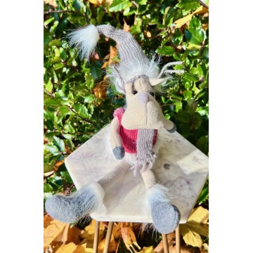 Med sine detaljerede træk og afslappede positur passer det perfekt på reolen, vindueskarmen eller som en del af en større juledekoration. Uanset om det står alene eller sammen med andre julefigurer, vil det siddende rensdyr sprede en skøn julestemning, der bringer varme og charme ind i ethvert rum. Mål: H: 40 cm x B: 10 cm. Materiale: Bomuld, sand, plastik, garn Vægt: 174 g. Farver: Grå, hvid, rød, sort