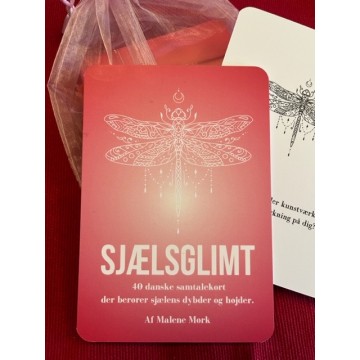 SjælsGlimt – Malene Mørk Spirituelle samtalekort på dansk! Det er et lækkert, mega feminint, rosa og seriøst sweet as candy kortsæt, der gør sig rigtig godt i en cirkel, på et retreat eller bare som samtalestartere på en hyggelig aften med vennerne eller familien. Spørgsmålene på kortene giver anledning til gode refleksioner og dybe snakke. Når man nu mangler et kortsæt… – må man jo lave det, det var tanken da Malene besluttede at lave SJÆLSGLIMT. Intentionen var at lave et kortsæt på dansk, med spørgsmål der berører de vigtigste, inderste, spirituelle emner, – og på den måde hurtigt danne grundlag for dybe samtaler. Det kom der samtalekortene SJÆLSGLIMT ud af. Kortene kan bruges i forbindelser med kurser, cirkler, retreats… eller bare sammen med familien eller vennerne, på en hyggelig aften; steder hvor mennesker mødes, og har brug for et virkelig meningsfuldt emne, at snakke om. Jeg vil bruge dem i starten af nye forløb og på retreats, hvor jeg sætter deltagerne sammen to og to, beder dem trække et par kort hver, gå lidt afsides og have en samtale i et givent tidsrum. Spørgsmålene er samtalestartere, der giver anledning til gode refleksioner og dybe snakke. Kortene fungerer de smukt som “icebreakers” mellem mennesker der lige har mødt hinanden. De 40 kort er svanemærket trykt og leveres i en organzapose. Antal kort: 40 Idé og design: Malene Mørk