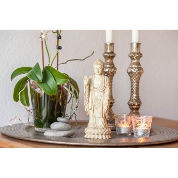 Denne er i hvid-sten finish! Stående Buddha-figurer i museums-kvalitet med håndstilling velsignelse. Højde 24,5 cm. massiv og vejer 1.085 kg. pr. stk.