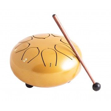 Ståltunge tromme, guldfarvet str. M Ståltunge tromme med otte toner. Den leveres med to køller, 2 "fingerspidser", en melodibog og en taske med lynlås.Denne ståltunge-tromme fremmaner himmelske, sfæriske lyde. Du behøver ingen træning til dette. Følg dit hjerte og din intuition og "bare begynd" at spille. Lydene inspirerer sjælen og renser vores ånd. Denne meditative aktivitet og de høje vibrationer bringer os indre ro og centrering. Mål: H: 9 cm, Ø: 15 cm