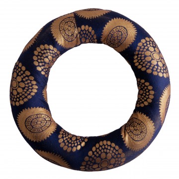 Stor blå pude/donut til syngeskål 26 cm Denne syngeskålspude har et traditionelt nepalesisk udsèende. Det magiske guldbroderi bringer et eksklusivt præg til rummet.Meget velegnet til ekstra store syngeskåle. Fyldt med kraftig bomuld.Mål: Udvendig diameter: 26 cm
