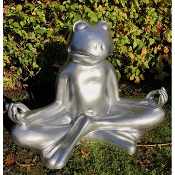 Yoga frø i farven Sølv. Yoga frøen elsker at dyrke yoga. Her sidder han i lotusstilling. Lotusstillingen er enkel, men ikke desto mindre kræver den alligevel, at frøen er smidig. Lotus er en enestående meditations stilling. Meditation – det er kunsten at berolige dine tanker og fokusere dit sind på en ting. Hvis sindet i sidste ende kun har brug for sig selv, er mange eksterne ting nyttige til meditation. Så meditation tilbehør kan fremme det indre tilbagetog og bidrage til at gøre meditationen behageligt. Kan stilles både indendørs og udendørs (ikke frostbestandig) Materiale: Polyresin. Mål: H: 49 x B: 66 x D: 35 Vægt: 5 kg