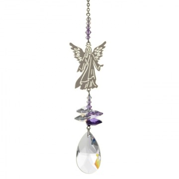 Engel med Swarovski Krystal. Der 12 små krystaller i lilla farver og en stor klar krystal. Skab Feng Shui med denne smukke Woodstock krystal i hjemmet, på kontoret eller hvor du har brug for gode energier. Mål: 22 cm er hele uroen med kæde. Med 40 mm dråbe Swarovski krystal, 4 mindre krystaller og 10 små perler.