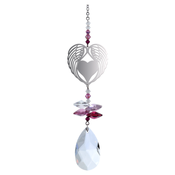 Håndlavet Crystal Fantasy i Angel Wing Heart design. En spejlfinish, metalmotiv er ophængt mellem en matchende perlerække og krystalkaskade i rødlige farver, der indeholder kvalitets Swarovski-krystaller og fuldender med en strålende klar krystal vedhæng for maksimal regnbueeffekt. Hele længde: 23 cm med krog til ophæng Den store krystal: 38 mm Materiale: Metal og Swarovski krystaller.