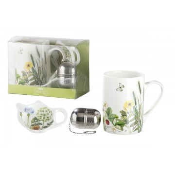 Materiale: Krus af porcelæn. Si af metal. Farve: Knus hvidt. Udsmykning i forskellige farver. Mål: H: 10 x B: 12,5 x D: 8,5cm Mål Krus: H: 10,5 x B: 7 cm. Bredde med hank 11 cm Mål te æg: 5 x 3,5 cm Mål tepotte til te æg: 8 x 6 cm
