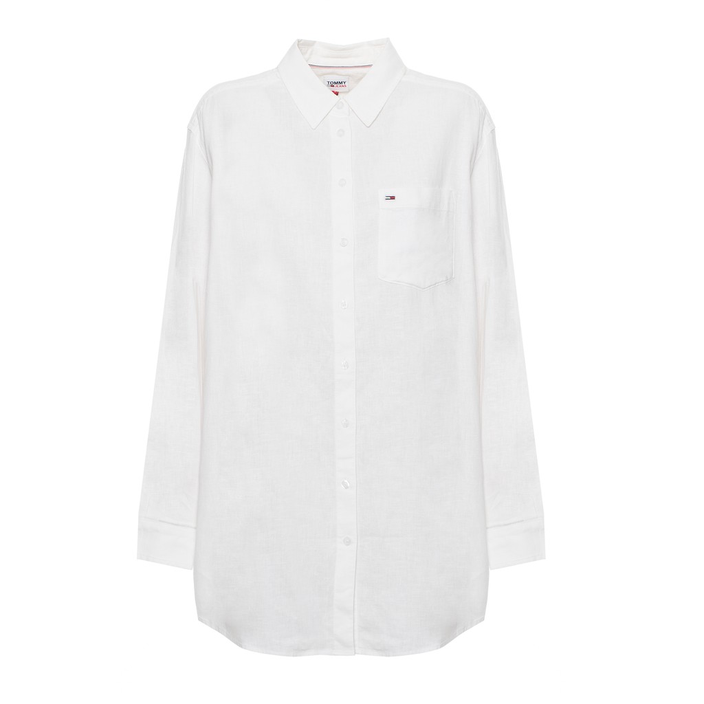 Super lækker lang skjorte fra Tommy Jeans, med lange ærmer og logo broderet på bryst lommen. Dejlig let og sommeragtig. Farve: White. Fremstillet i 55% hørlærred, 45% viscose.