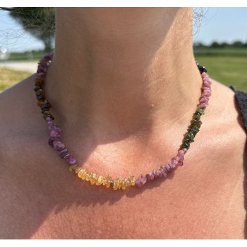 Smukt armbånd med små facetslebne turmalinsten. Turmalin har beskyttende egenskaber mod alle former for negativ energi og stråling. Turmalin har en stærk beroligende virkning, der vil give lindring af stress. Hvis du føler dig overvældet af begivenhederne i dit liv, vil turmalinens energi give dig pusterum fra stress og jag. Det er en sten, der giver indsigt og hjælper dig med at opdage, hvad der er godt i dit liv. Det vil holde tingene i perspektiv for dig, og det får dig til at føle dig taknemmelig for alle dine velsignelser. Turmalin hjælper dig med at opnå oplysning. Det viser dig, hvordan du kan have magt over de begivenheder, der sker med dig. Regnbue turmalin navnet stammer fra Singhaleser "turamali", hvilket betyder sten med flere farver. Turmalin kommer i flere farver rød, grøn, blå, gul. Stenene har ofte flere farver i en sten, og kan endda skifte farve. Turmalinens farvevariationer skyldes i følge et gammelt egyptisk sagn, at stenen rejser fra jordens indre og på denne rejse passerer den gennem en regnbue, og ved denne passage optog den alle regnbuens farve. Halskæden er ca. 40 – 45 cm. Bemærk venligst: Dette er et naturprodukt, så farve, form og størrelse kan variere og afvige fra det viste billede. Flerfarvet turmalin handler om sit farverige design. Der er intet andet mineral, som kan konkurrere med flerfarvet turmalin i farvevariation. Det nuancerer fra slående røde, pastelrosa eller fersken nuancer samt i dyb smaragdgrøn, gul eller dybblå farve. En sådan en forskellighed påvirkes af stenens variable struktur. Det er populært inden for smykker, og krystallerne kommer fra USA, Kina, Brasilien eller Madagaskar. Kemisk struktur af turmalin er variabel, med mange blandinger.